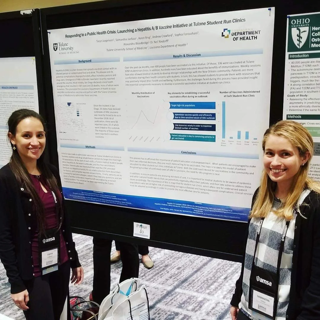 Jurgensen, T., Janfaza, S., Brug, A., Craford, A., Foroushani, S., Woodbridge, A., & Nixdorff, N (MD). Responding to a Public Health Crisis: Launching a Hepatitis A/B Vaccine Initiative at Tulane Student Run Clinics. (2019).