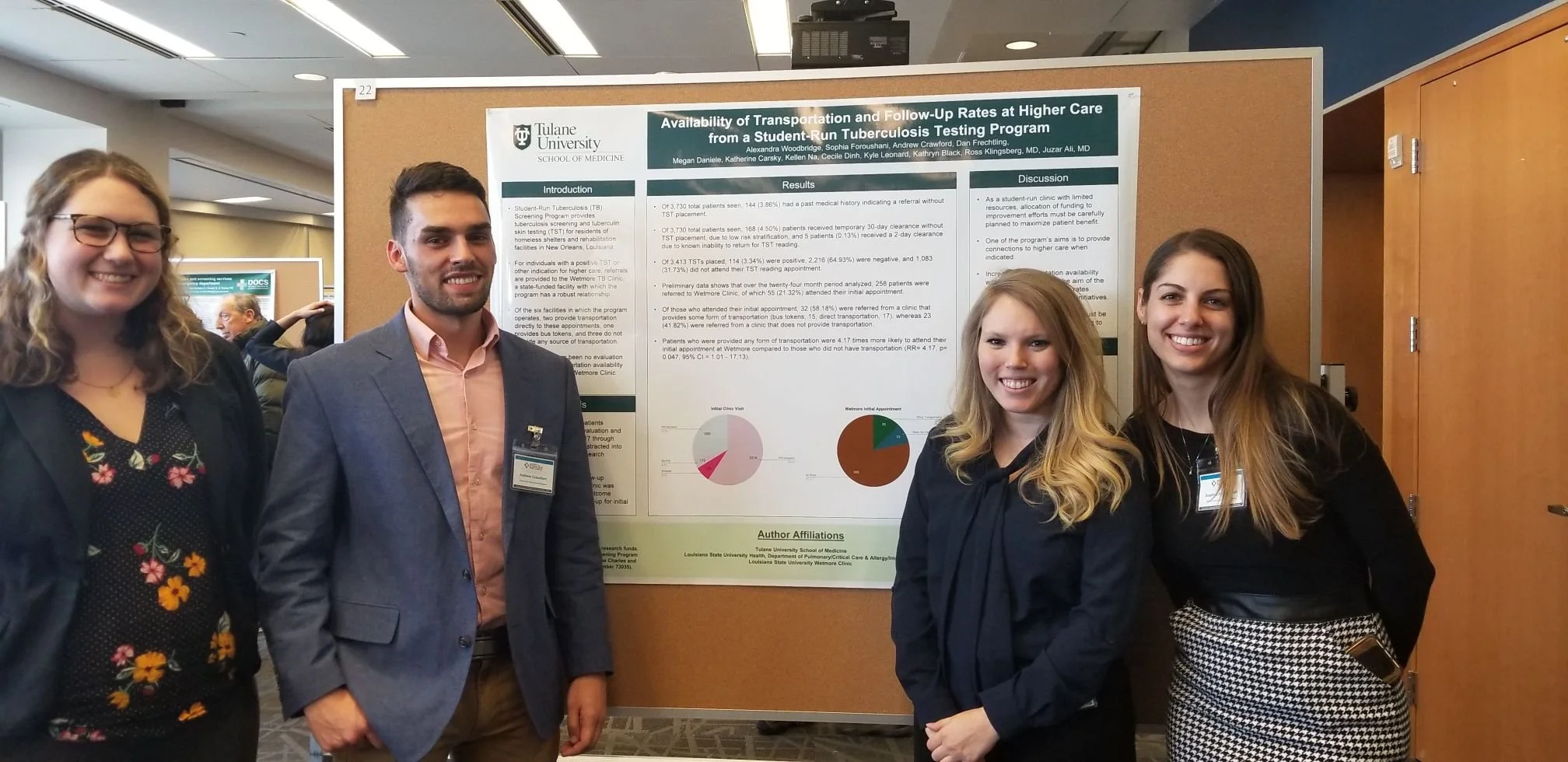 Woodbridge, A., Foroushani, S., Crawford, A., Frechtling, D., Daniele, M., Carsky, K., Na, K., Dinh, C., Leonard, K., Black, K., Klingsberg, R. (MD), & Ali, J (MD). Availability of Transportation and Follow-Up Rates at Higher Care fro a Student-Run Tuberculosis Testing Program. (2019)